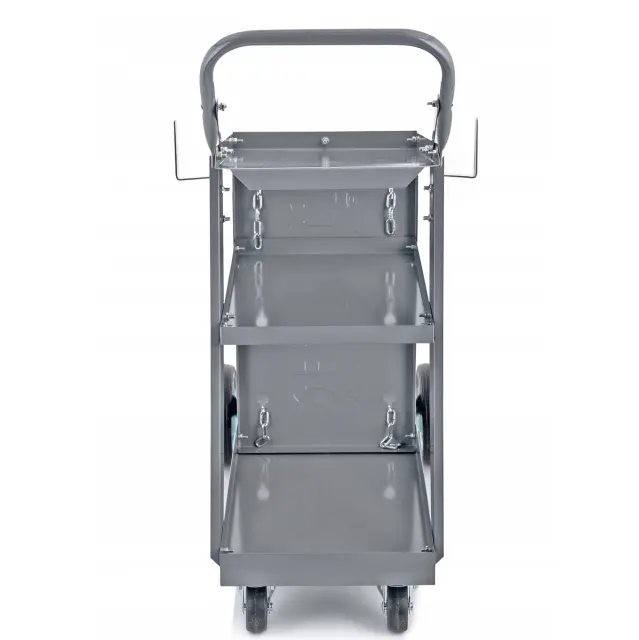 Zgornja polica za varilni stroj, drugi dve z veliko prostornino za pribor. Na zadnji strani vozička je polica za jeklenke skupaj z dvema verigama za stabilizacijo