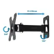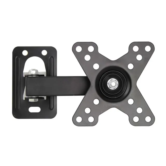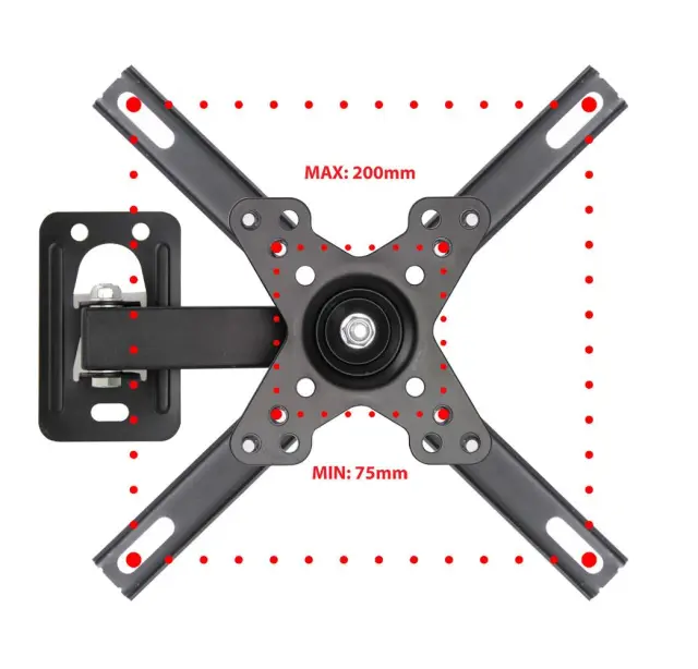Kovinski, robusten stenski nosilec za televizorje velikosti od 12″ do 50″. Enostaven za namestitev. Združljiv s standardom VESA 75x75mm – 200x200mm. Priložena je majhna vodna tehtnica za enostavno izravnavo nosilca. Nosilec ima nastavljiv naklon, nastavitev kota odklona vodoravno in nastavljivo oddaljenost televizorja od stene.