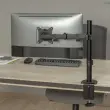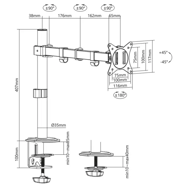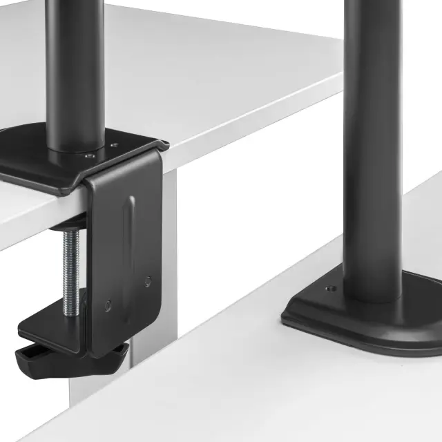 V samo nekaj preprostih korakih lahko držalo namestite na rob mize zahvaljujoč nastavku za sponke. Za položaj vpenjanja lahko izbirate med dvema načinoma pritrditve, tako da je držalo primerno za mizne plošče debeline od 10 do 45 mm in od 45 do 85 mm. Ta vrsta pritrditve ima prednost, da držalo zavzame skoraj nič prostora na mizi in tako zagotavlja prostorno delovno mesto. Poleg tega lahko držalo za monitor povežete s ploščo mize z nastavkom za ušesa. V ta namen mora biti plošča opremljena z luknjo s premerom od 10 do 60 mm. Druga možnost je, da ustrezno luknjo naredite z ustreznim svedrom (ni priložen).