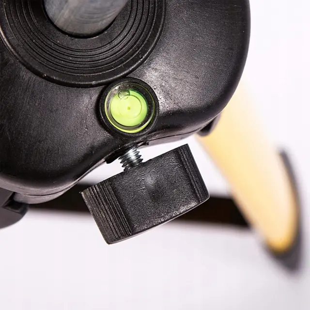 Na vrhu našega novega laserskega nivelira je majhna okrogla viala. Obstaja dodatek, ki bo olajšal uporabo opreme, saj nam omogoča, da stojalo vedno postavimo enakomerno vodoravno.
