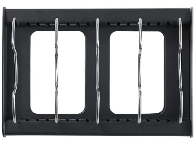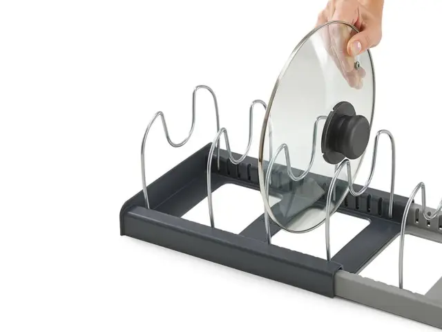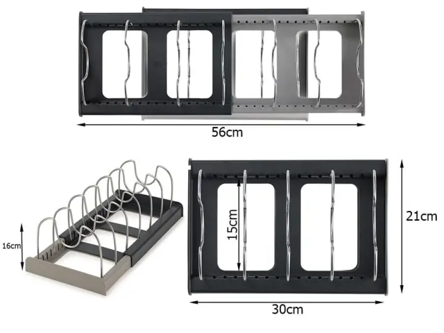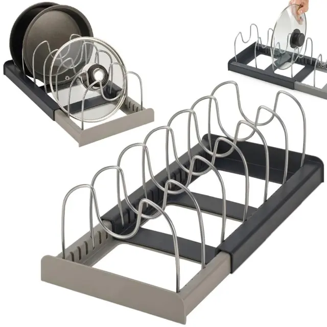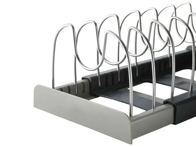 Stojalo je opremljeno s 7 nastavljivimi rokami , ki jih lahko poljubno konfigurirate glede na vaše potrebe. Izdelate lahko večje ali manjše pregrade . Naprava se izvleče glede na število posod, ki jih želite zložiti. Najmanjša širina je 30 cm, največja 56 cm.
