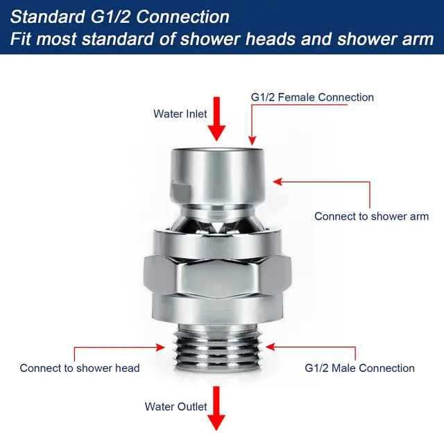 Vrtenje za 360°: Ta obračalni spoj za tuš glavo omogoča popolno vrtenje za 360 stopinj, kar vam zagotavlja vrhunsko prilagodljivost in udobje pri usmerjanju tuš glave v želeni kot.