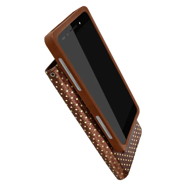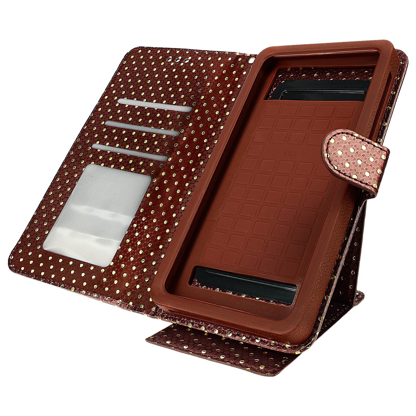 Univerzalni ovitek za denarnico z magnetnim jezičkom. Združljiv pametni telefon največje velikosti 146 x 80 mm. Zlati pikčasti vzorec, ki daje prizoru poživitev. Navpično drsni sistem za uporabo s kamero.