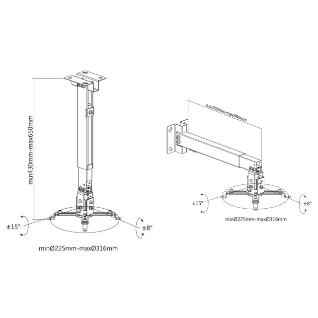 Z razmikom lukenj 225–316 mm in nosilnostjo do 20 kg je robusten jekleni nosilec projektorja primeren za večino komercialno dostopnih modelov projektorjev in projektorjev.
