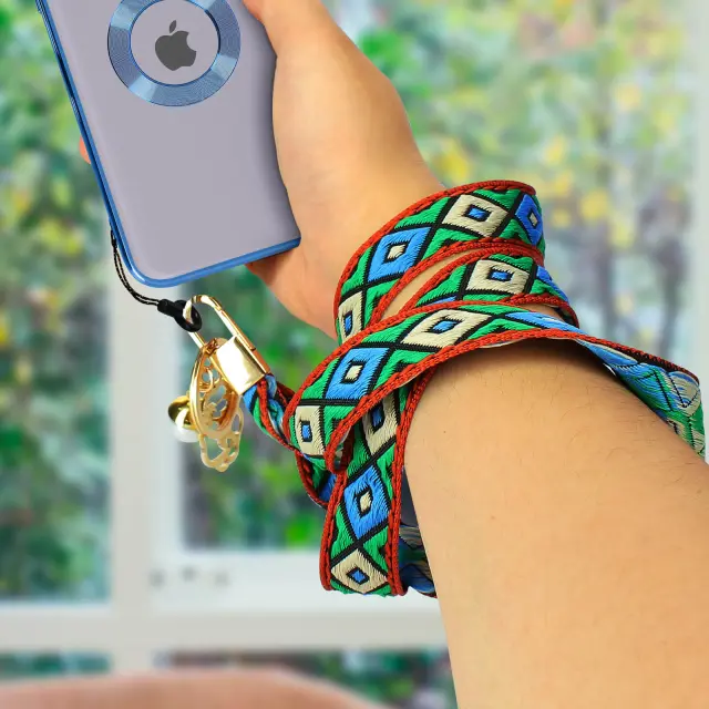 bogolan ogrlica za pametni telefon, da bo vaš pametni telefon na dosegu roke, medtem ko bodo vaše roke proste. Pleten bombažni pas z biseri Akoya za vec sloga. Primeren je za vse vrste ohišij in školjk.