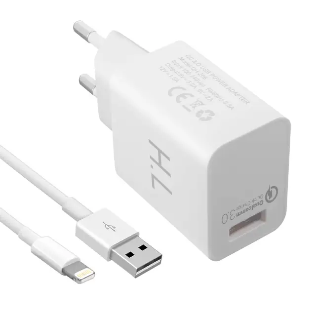 Omrežni polnilnik je združljiv z vsemi pametnimi telefoni in tabličnimi računalniki, opremljenimi s priključkom Lightning. Tehnologija Qualcomm Quick Charge 3.0 napolni vašo napravo do 50 % v 15 minutah. Napajajte vse druge naprave z namenskim kablom prek univerzalnega USB izhoda. Enostaven za namestitev in uporabo, preprosto ga priključite v stensko vtičnico ali razdelilnik.