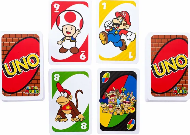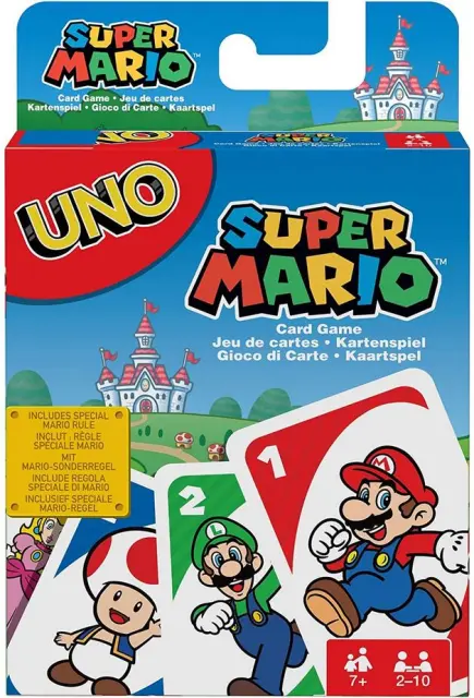 Pridruži se Mariu, Luigiju in vsem njunim prijateljem v posebni igri UNO! To je klasična igra UNO, ki jo imaš rad, a zdaj s posebno karto Mario Super Zvezda, ki te naredi nepremagljivega! Ko drug igralec odigra karto Vzemi Dve ali Vzemi Štiri, lahko odigraš karto Super Zvezda, in prejšnji igralec mora SAM vzeti dve ali štiri karte! Zasluži točke tako, da se prvi znebiš vseh svojih kart v vsaki rundi. Prvi igralec ali ekipa, ki doseže 500 točk, zmaga. In ne pozabi zaklicati "UNO," ko ti ostane le ena karta! Igra vsebuje 112 kart in preprosta navodila. Za 2 do 10 igralcev, stare 7 let in več. Možne so različne barve in okraski.
