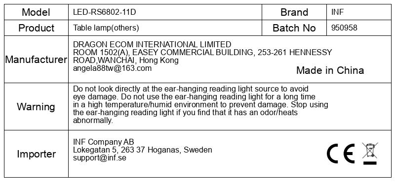 Ne glejte neposredno v vir svetlobe za branje, ki visi na ušesih, da preprečite poškodbe oči. Ušesne bralne lučke ne uporabljajte dlje časa pri visoki temperaturi/vlažnem okolju, da preprečite poškodbe. Nehajte uporabljati ušesno bralno lučko, če ugotovite, da ima nenormalen vonj/nenormalno segrevanje.