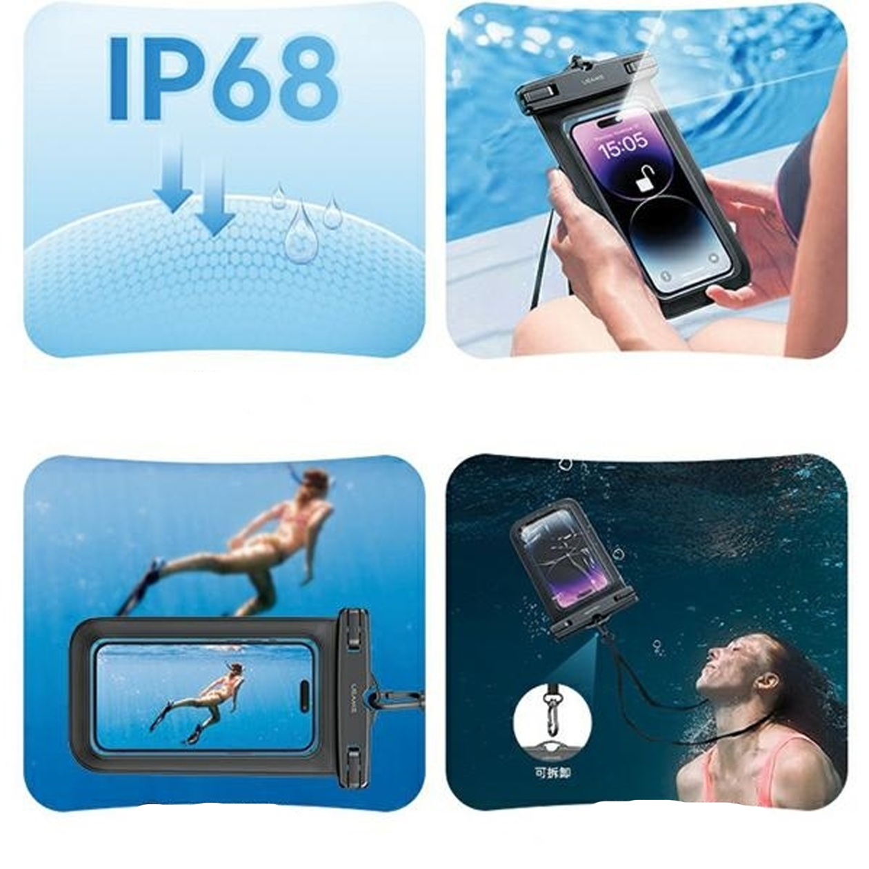 Z napredno tehnologijo zaščite IP68 ohišje USAMS zagotavlja izjemno odpornost na vodo, prah in onesnaženje. Njegova prozorna struktura omogoča popolno vidljivost zaslona in hkrati zagotavlja najvišjo kakovost zaščite. Doživite vsak trenutek brez skrbi za svoj telefon – z ovitkom USAMS ste lahko prepričani, da je varen, ne glede na pogoje.