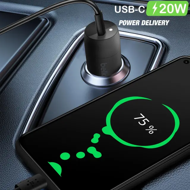 USB-C 20 W polnilnik za vžigalnik Belkin za polnjenje vaših naprav na poti. Hitro polnjenje zahvaljujoč USB-C 20W Power Delivery. Lahko napolni združljiv pametni telefon od 0 do 50 % v 30 minutah. Notranje pametno elektronsko vezje za optimalno polnjenje vaših povezanih naprav.