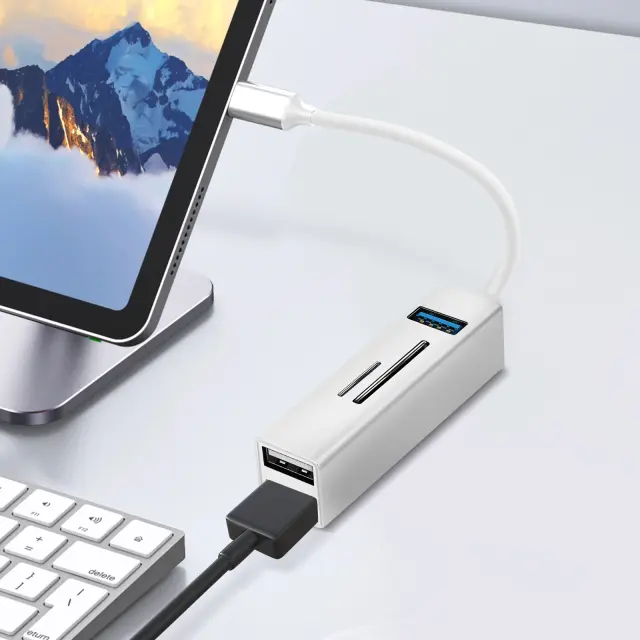 Razširite povezljivost svoje naprave s tem srebrnim zvezdišcem USB-C z vec vrati. Njegova 3 vrata USB s funkcijo OTG vam omogocajo prenos podatkov in povezovanje razlicnih zunanjih naprav. Ima tudi citalnik kartic SD in micro-SD.