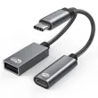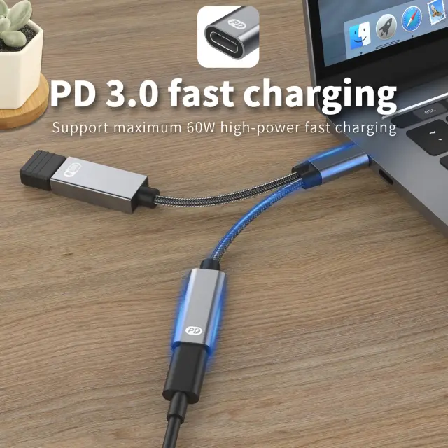 Adapter USB-C z vtičnico USB-C za hitro polnjenje PD 3.0 do 60 W in vtičnico USB za priključitev perifernih naprav USB (samo naprave USB 2.0). Omogoča hitro polnjenje in hkrati hiter prenos podatkov.