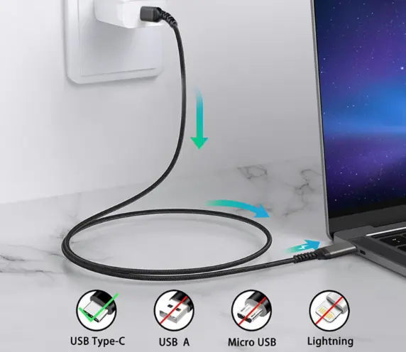 Vrhunski polnilni kabel USB-C s pametnim čipom E-marker, ki identificira optimalno napajanje. Polnilni kabel podpira največjo izhodno moč 100 W in hitrost prenosa podatkov do 480 Mbps. Polnilec je kompatibilen z vsemi napravami z USB-C vtičnico.