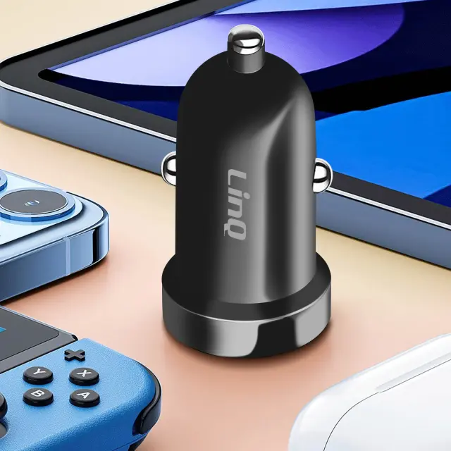 Avtopolnilec, izhod USB-C, znamke LinQ. Uživajte v izjemno hitri moci s tehnologijo Power Delivery 20 W. Združljiv je z napravami, ki se polnijo preko USB-C kabla. Vgrajene zašcite za varno polnjenje.