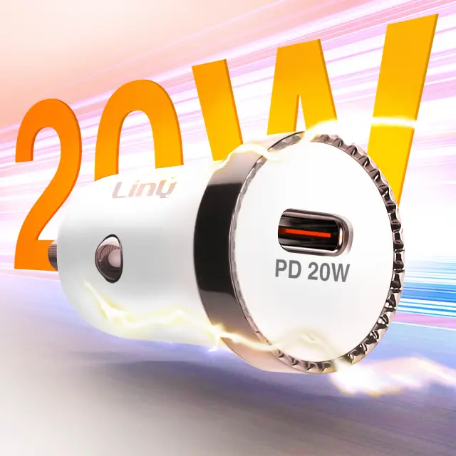 Avtopolnilec, izhod USB-C, znamke LinQ. Uživajte v izjemno hitri moci s tehnologijo Power Delivery 20 W. Združljiv je z napravami, ki se polnijo preko USB-C kabla. Vgrajene zašcite za varno polnjenje.