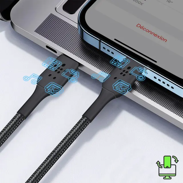 Napolnite in sinhronizirajte svojo napravo s tem crnim kablom USB-C v Lightning podjetja Belkin. Ucinkovit, opremljen je s tehnologijo Power Delivery 18 W, ki zagotavlja hitro polnjenje. Zagotavlja tudi varno polnjenje. 2m dolžine.