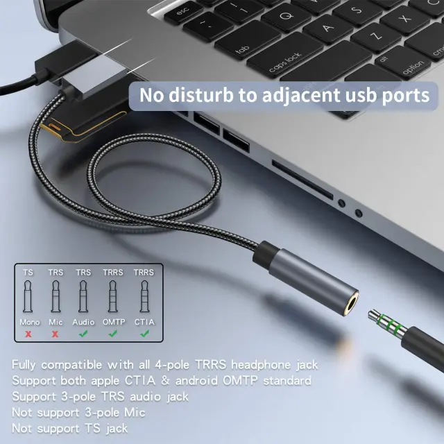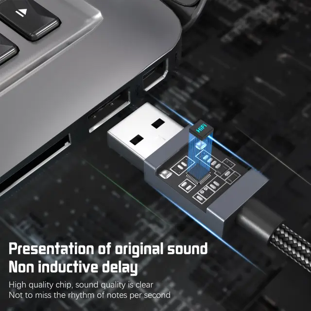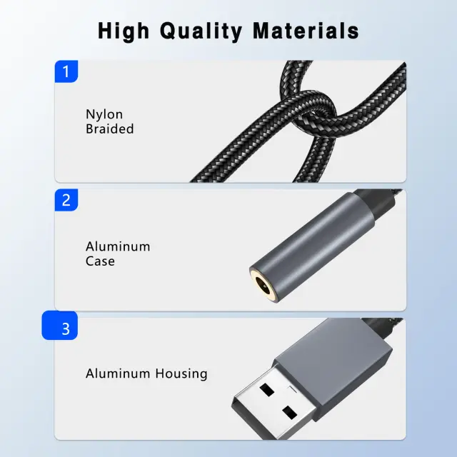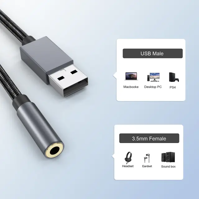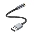 Visokokakovosten USB-A adapter za slušalke, ki zagotavlja stabilen prenos iz naprave z USB vtičnico na vaše žične slušalke s 3,5 mm priključkom. Priročna rešitev, če vaš računalnik nima priključka za slušalke.