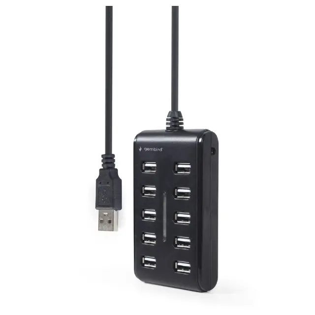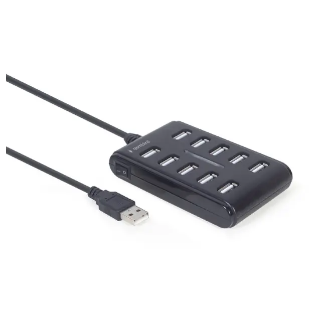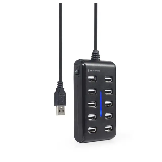 10-vratni USB 2.0 hub s stikalom vklop/izklop in z integriranim kablom, dolžine 80 cm.