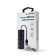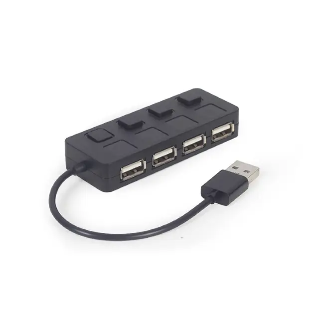 4-vratni USB 2.0 hub s stikali za vklop/izklop in z integriranim kablom, dolžine 15 cm.