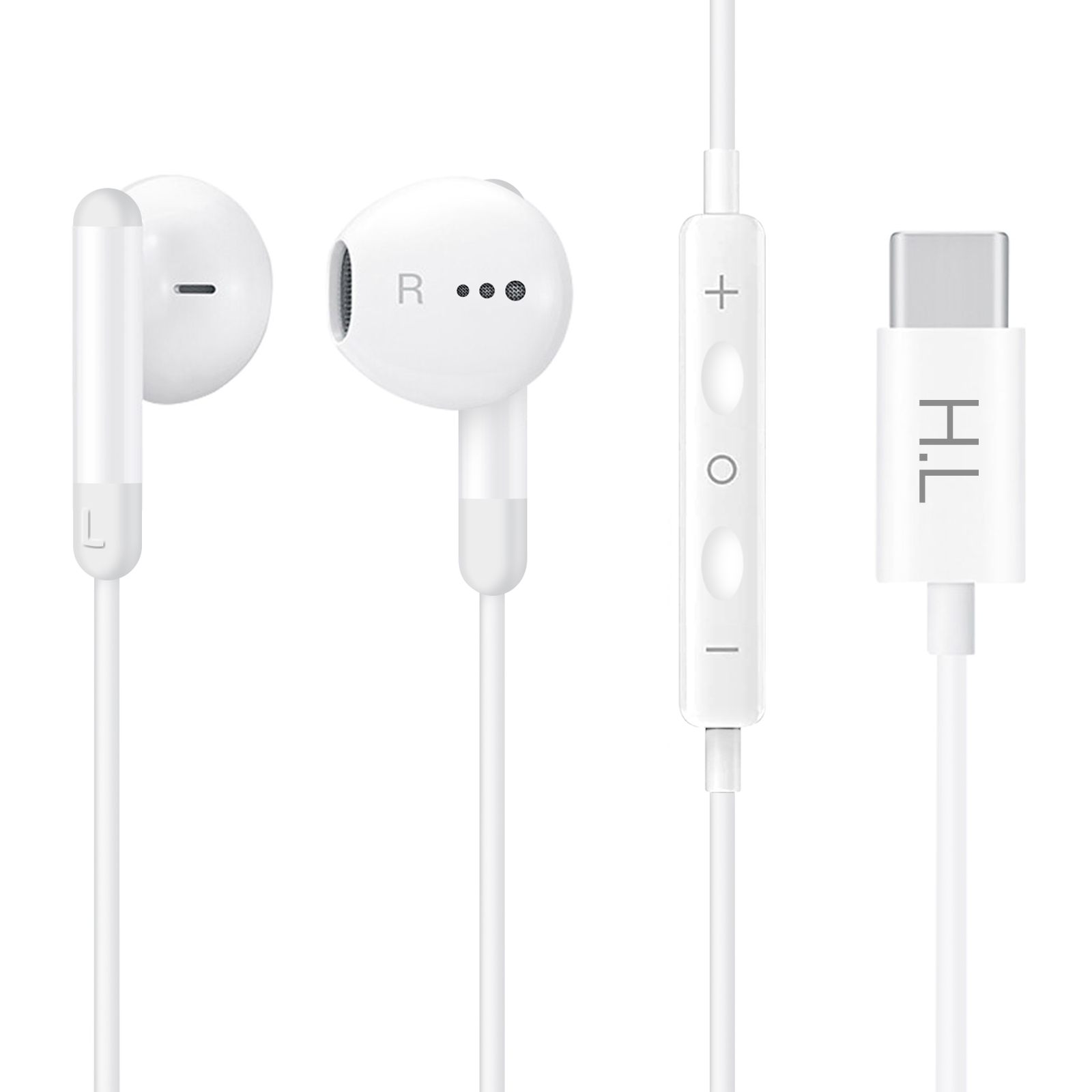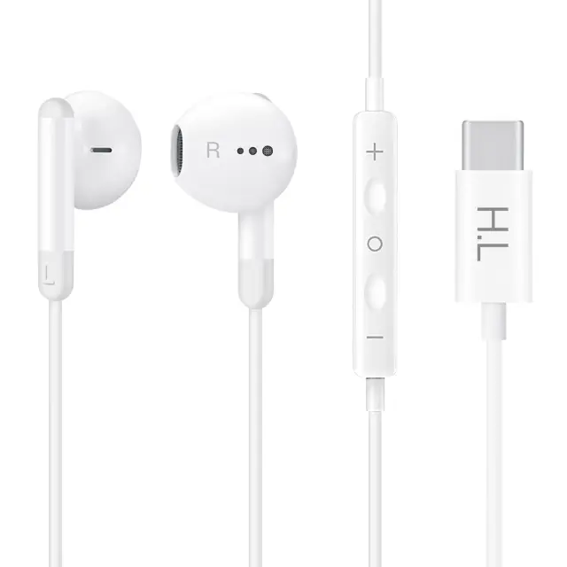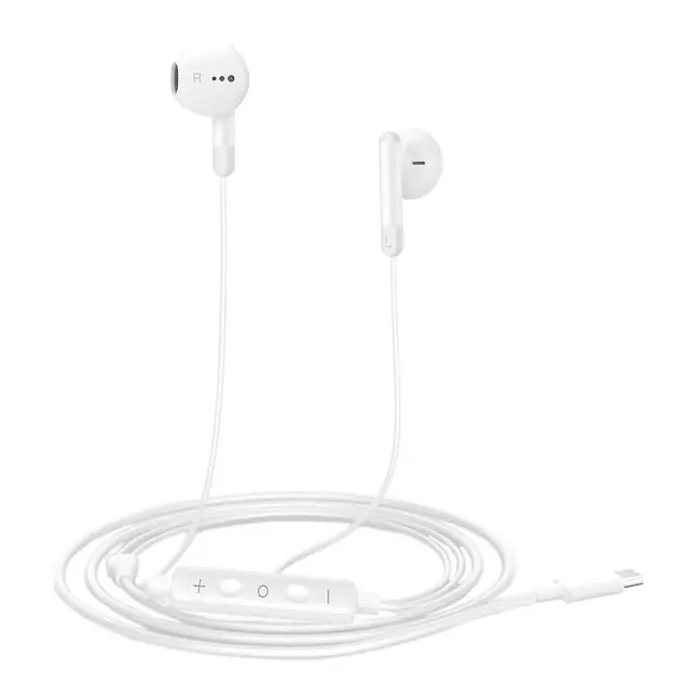 komplet slušalk z vtičem USB tipa C. Ušesni nastavki, ki so udobni za nošenje. Daljinski upravljalnik: povečanje/zmanjšanje glasnosti, predvajanje/pavza, prejšnja/naslednja skladba, sprejem/prekinitev. Vgrajen mikrofon za funkcijo kompleta za prostoročno telefoniranje.