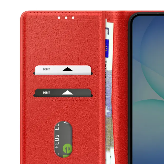 To ohišje zagotavlja vsestransko zaščito pred udarci in praskami. Eleganten ovitek denarnice iz zrnatega umetnega usnja. Vgrajena video podpora za optimalno udobje. Praktične reže za kartice.