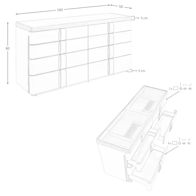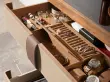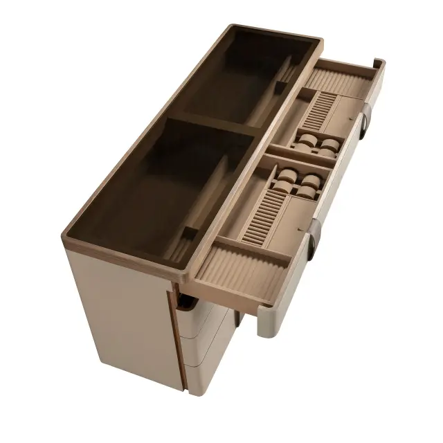 - Elegantno oblazinjenje iz usnja norke in čokoladno rjavi usnjeni ročaji ustvarjajo sodobno in prefinjeno estetiko. Poleg vizualne privlačnosti ponuja tudi brezhibno organizacijo zaradi predalov s posebej oblikovanimi predali za nakit, ure in drobne dodatke, ki zagotavljajo, da ima vsaka podrobnost svoje mesto in oskrbo.