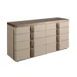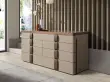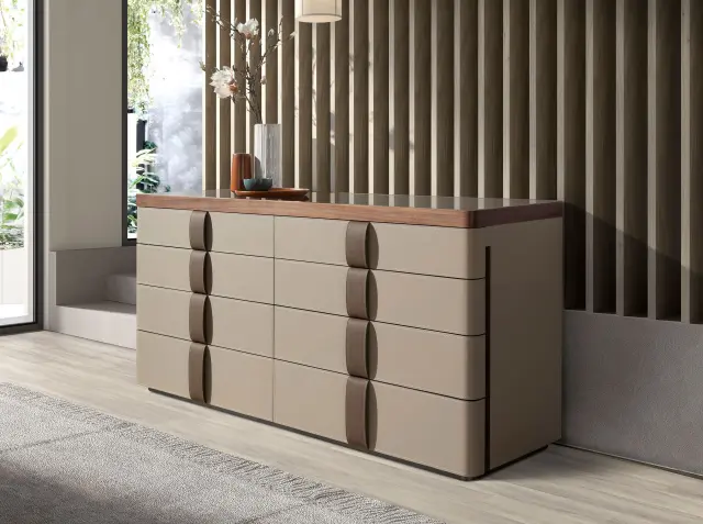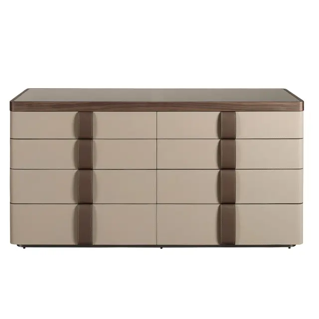 Moderno oblikovana komoda s strukturo iz lesa, furniranega z naravnim orehovim furnirjem, oblazinjena z govejim usnjem barve norke, in originalnim podnožjem iz poliranega nerjavnega jekla. Zahvaljujoč elegantnemu vrhu iz rjavega dimljenega stekla boste v svojih prostorih dobili prefinjen videz, ki ga iščete. Ima velik prostor za shranjevanje z 8 predali s sistemom odpiranja s potegom in sistemom mehkega zapiranja.