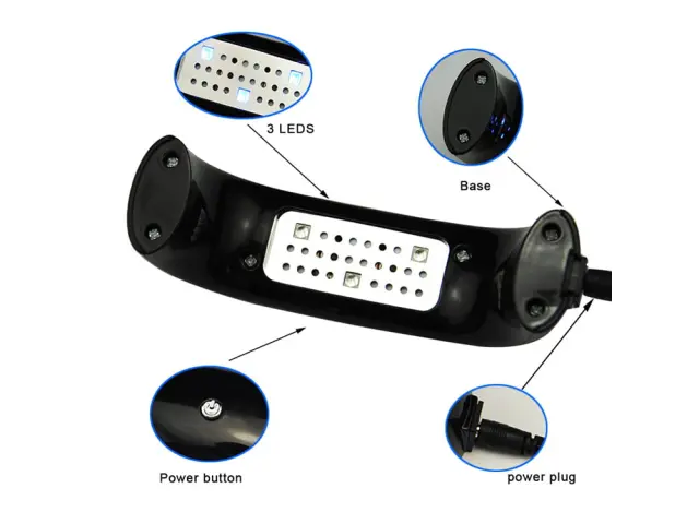 Visoka kvaliteta Utrjuje gele, akrile in hibridne gel lake Moč: 9W Ima 3 vgrajene UV LED Samodejni izklop po 90 sekundah Napajanje: USB 5V Dolžina USB kabla: 99 cm Barva naključna Dimenzije: 14,5 cm x 4 cm x 5 cm USB kabel