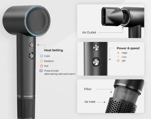 • Nastavitev temperature: sušilnik las H100 ponuja dve hitrosti in štiri nastavitve toplote, ki za prikaz temperature uporabljajo LED tehnologijo. Izbirajte med hladnim zrakom pri sobni temperaturi, nežno toploto pri 50 °C, vročim zrakom pri 70 °C ali pa se prepustite poživljajočemu hladno-vročemu ciklu.