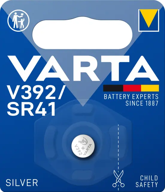 VARTA SILVER gumbasta baterija V392/SR41 1,55V. Pakiranje vsebuje 1 baterijo. Dimenzija celice: premer 7,9 mm/ višina 3,6 mm