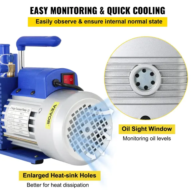 Dizajn z dvema stopnjama rotacijske lopatice: 8/9/10 CFM vakuumska črpalka z dvostopenjskim dizajnom rotacijske lopatice preprečuje onesnaženje z vračanjem olja, kar zagotavlja učinkovito ustvarjanje vakuuma.