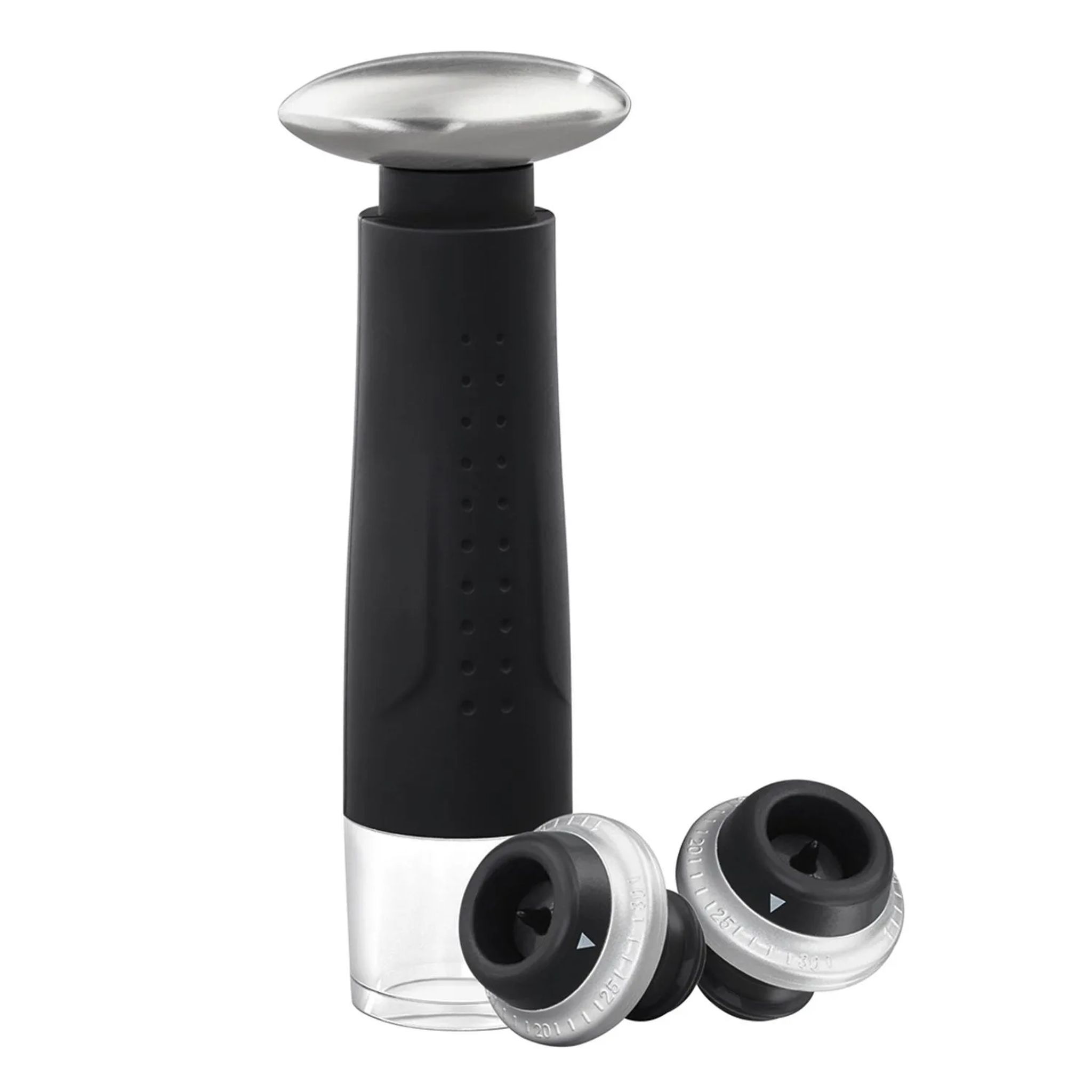 Začnite z vstavljanjem enega od dveh vključenih zamaškov v vrat steklenice. Zamaški so opremljeni s srebrnim vrtljivim obročem, ki prikazuje datum, kar olajša nadzor nad časom shranjevanja. Nato namestite črpalko na zamašek in z nekaj enostavnimi potegi ročaja izčrpajte zrak. Ko je vakuum ustvarjen, se zamašek samodejno zapre in ohrani vakuumsko stanje.