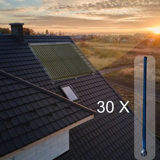 Učinkoviti pretočni sončni kolektor s 30 vakuumskimi cevmi je namenjen za ogrevanje vode s pomočjo sončne energije. Sistem brez hranilnika omogoča fleksibilno integracijo z obstoječim bojlerjem ali hranilnikom ter visoko učinkovitost delovanja skozi vse leto.