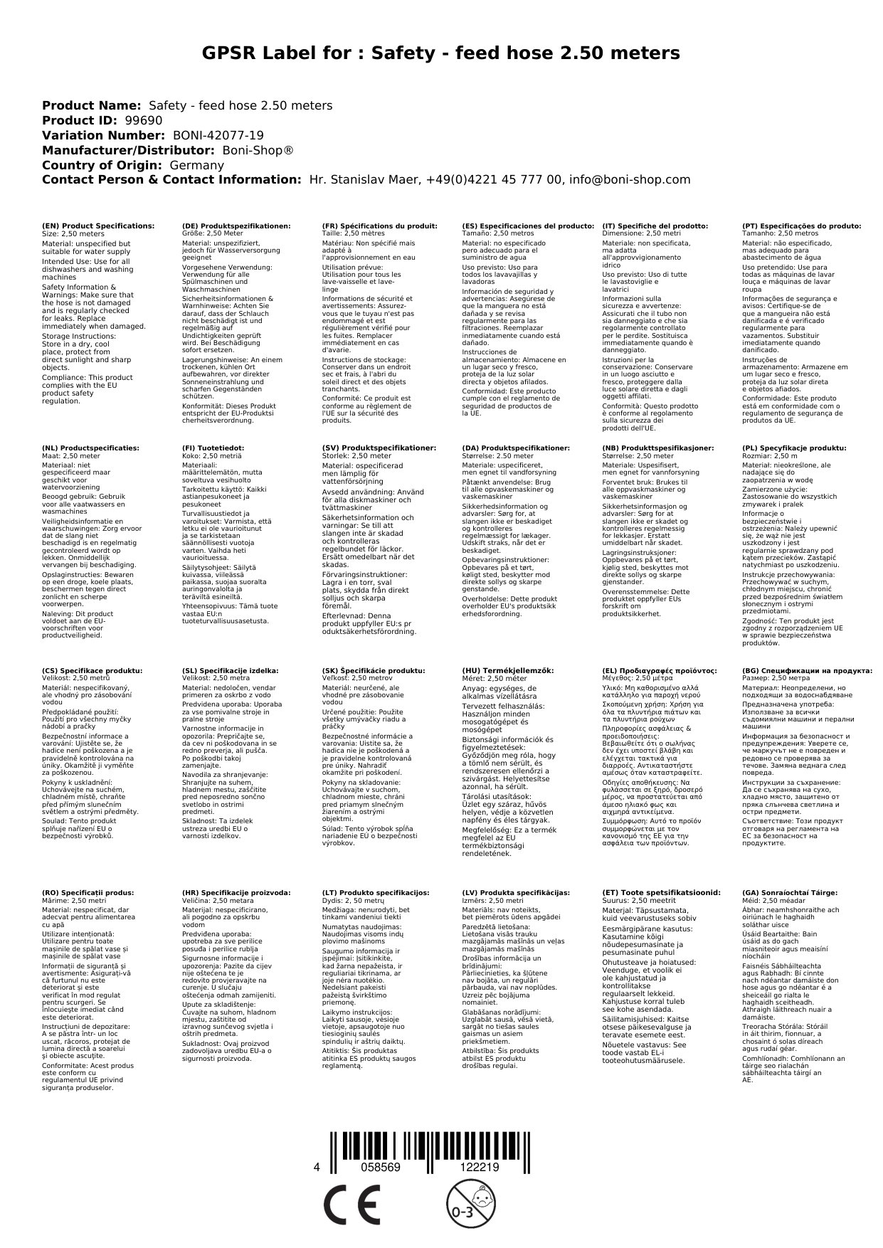 Varnostna dovodna cev 2,5 m z Aquastop sistemom in cev v cevi, temperaturno odporna do 90C
