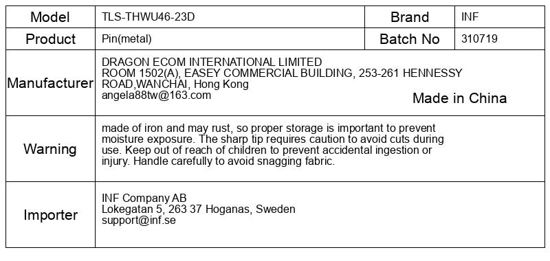 izdelan iz železa in lahko rjavi, zato je pravilno shranjevanje pomembno za preprečitev izpostavljenosti vlagi. Ostra konica zahteva previdnost, da se izognete urezninam med uporabo. Hranite izven dosega otrok, da preprečite nenamerno zaužitje ali poškodbe. Ravnajte previdno, da ne zataknete tkanine.
