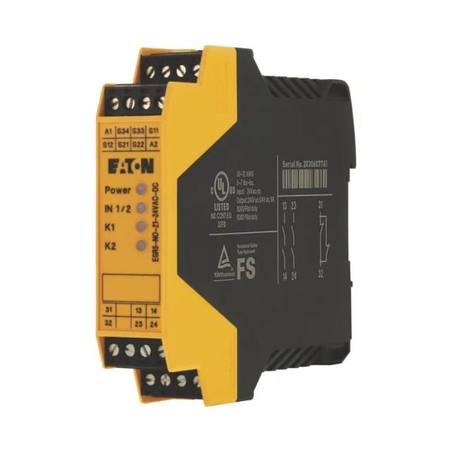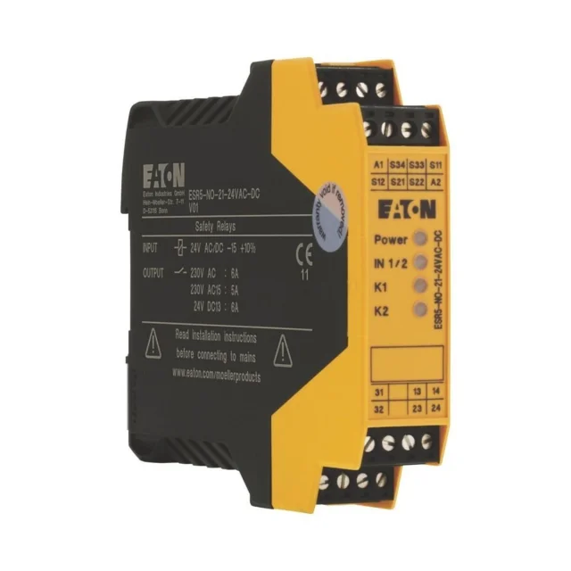 Z odobritvijo TÜV: daEaton varnostni rele ESR5-NO-21-24VAC-DC: Varnostni rele za izvajanje osnovnih funkcij izklop v sili / zaustavitev v sili / varnostna vrata, eno- ali dvokanalno delovanje, napajalna napetost 24 VDC ali 24 VAC 50/60 Hz, 2 toka za omogočanje (IEC/EN 60204 kategorija zaustavitve 0), 1 tok za signalizacijo, zaščita pred dotikom po EN 50274 z navpičnim sprožanjem iz sprednjega prsta in zadnje strani roke, primeren za PL e, kat. 4 po EN ISO 13849-1 / SILCL 3 po IEC 62061 / SIL 3 po IEC 61508 EAN: 4015081168408