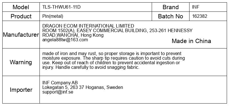 izdelan iz železa in lahko rjavi, zato je pravilno shranjevanje pomembno za preprečitev izpostavljenosti vlagi. Ostra konica zahteva previdnost, da se izognete urezninam med uporabo. Hranite izven dosega otrok, da preprečite nenamerno zaužitje ali poškodbe. Ravnajte previdno, da ne zataknete tkanine.