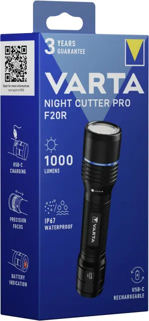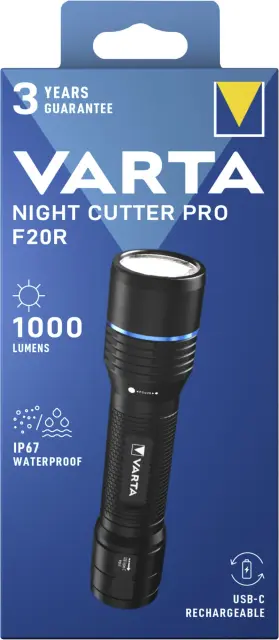 VARTA Night Cutter Pro F20R združuje elegantno obliko z robustnostjo in funkcionalnostjo: ohišje je izdelano iz robustnega aluminija letalske kakovosti, zaradi česar je odporna na udarce z višine 2 m in vodoodporna (IP67). Natančno ostrenje (brezhibna točka do preplavljanja) z izjemnim dosegom snopa 200 m, načinom utripanja, skritim priključkom USB-C ter indikatorjem polnjenja in napolnjenosti baterije omogočajo enostavno uporabo in so primerni za različne primere uporabe. Zato je prava izbira za uporabo na prostem, v gospodinjstvu, avtomobilu, lopi in delu, v nujnih primerih in ob izpadih električne energije.