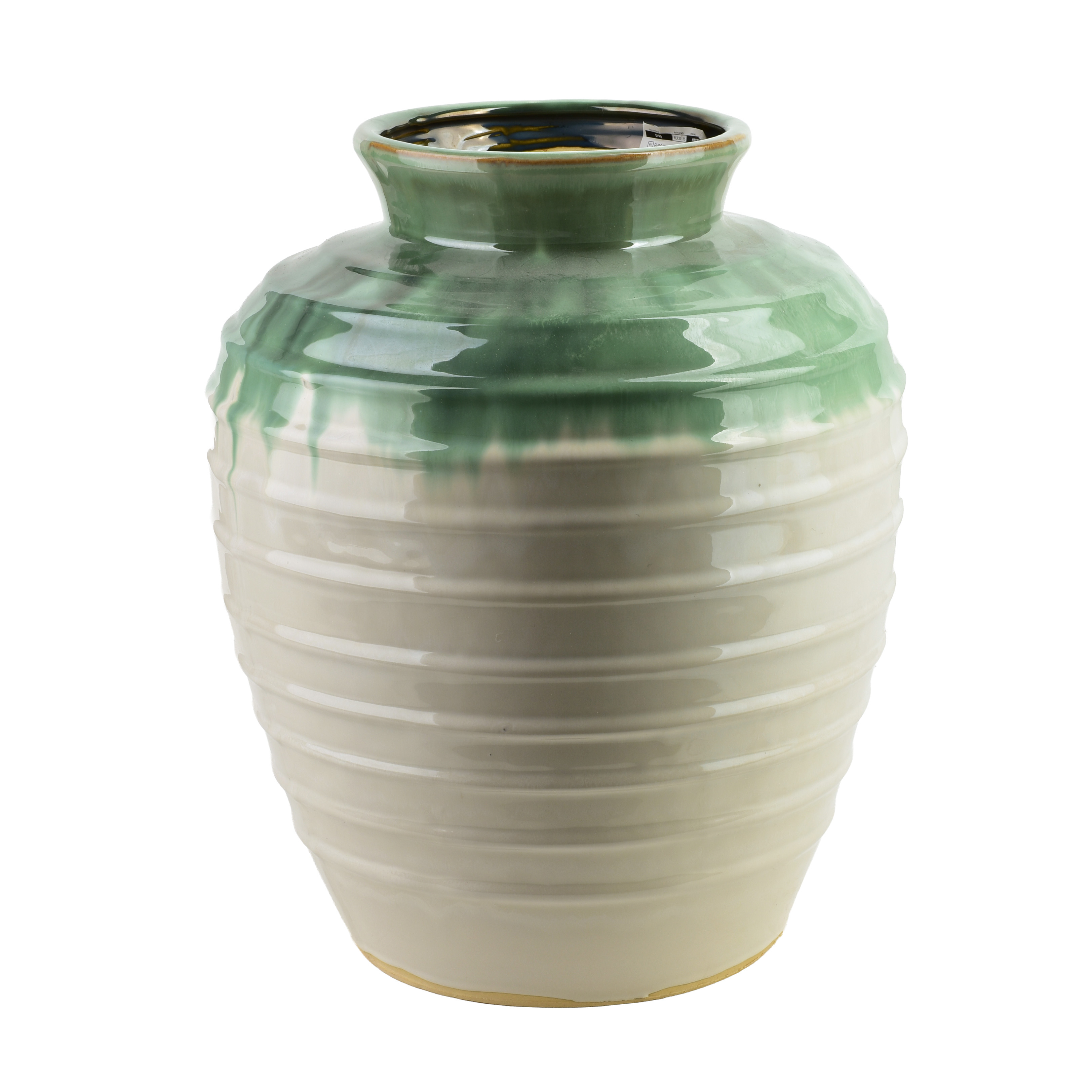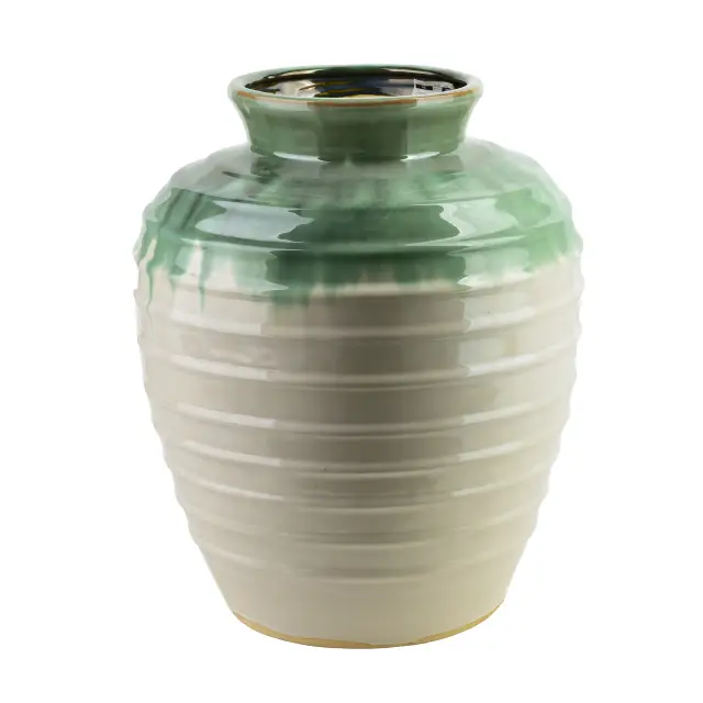Eleganten keramični vaza EVRO v zeleno-krem odtenkih prinaša naravno umirjenost in prefinjenost v vsak prostor. Sijajna glazura z nežnimi, tekočimi prehodi barv odraža organski, malce umetniški značaj vaze, ki se lepo poda k sodobnim, klasičnim in boho notranjim ureditvam.