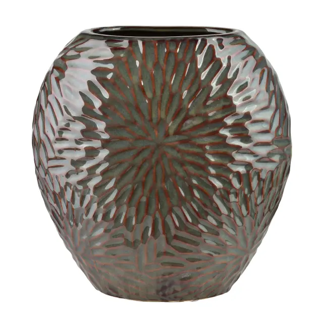 Eleganten keramični vaza YARINE v vijolični barvi, dimenzij približno 25 x 12 x 26 cm, združuje prefinjen estetski videz s praktično uporabnostjo. Vaza je izdelana iz kakovostne glazirane keramike in ima nežno vidno teksturo z vertikalnimi žlebovi, ki ji dajejo globino in značaj. Njena ploska, rahlo stožčasta oblika omogoča postavitev ob steno ali na ozko mesto, višina 26 cm pa poskrbi za lepo vizualno prisotnost na komodi, konzoli ali polici.