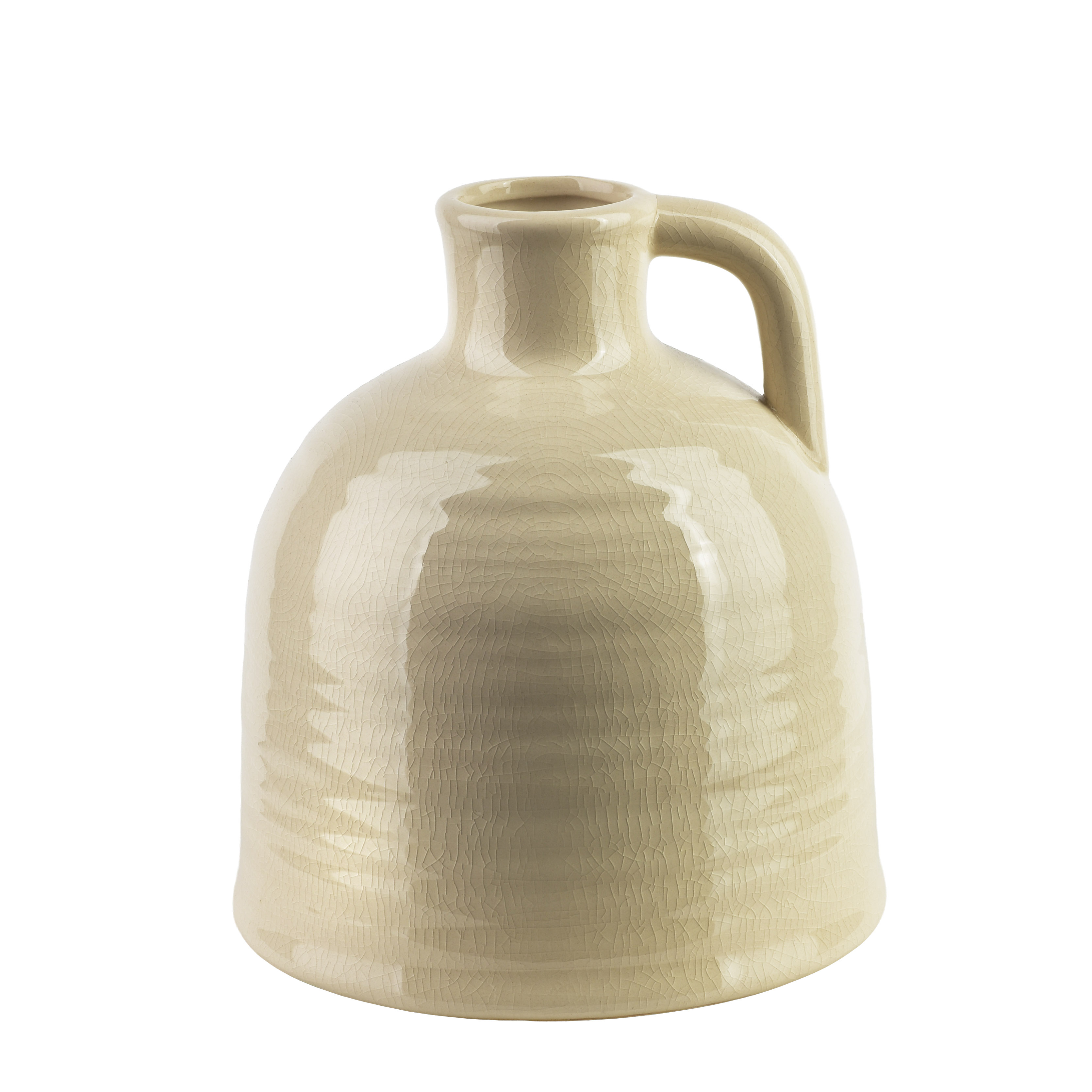 Praktičen ročaj omogoča enostavno prenašanje, 4,5 cm širok vrat pa nudi primerno oporo za sveže ali suhe cvetlične aranžmaje. Dimenzije približno: višina 22 cm, premer približno 16 cm – primeren za različne prostore in vrste dekoracij.