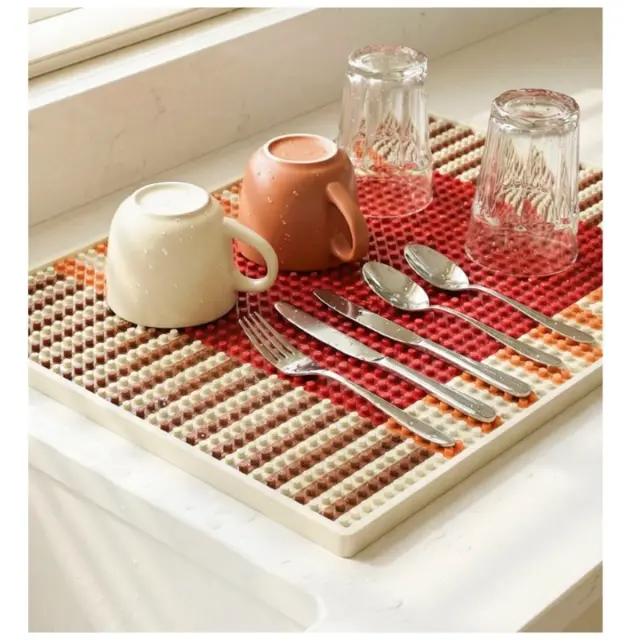 3D odvodnjavanje: Ne glede na pritisk med strežbo ta podloga uporablja tridimenzionalni odtočni dizajn, ki usmerja tekočino stran od površine pulta, preprečuje zadrževanje vode in omogoča hitro odtekanje. Vzvišena tekstura in zareze zagotavljajo prezračevanje kozarcev in posode, zmanjšujejo stoječo vodo in prispevajo k bolj higieničnemu sušenju, s čimer ohranjajo delovni prostor čistega in pripravljeno za nadaljnjo uporabo.