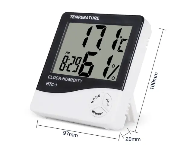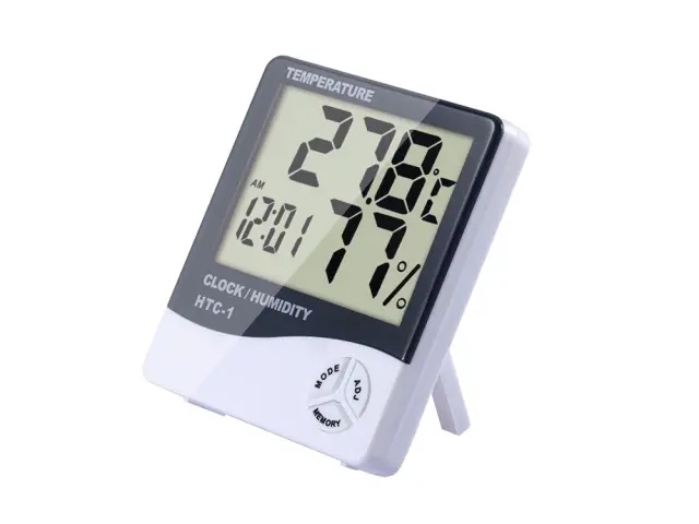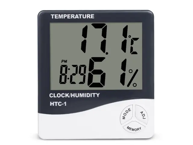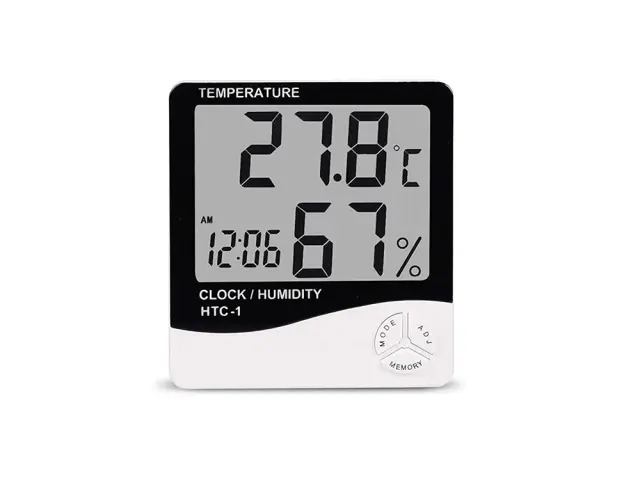Jasen LCD zaslon, ki prikazuje notranjo temperaturo, uro/datum in vlažnost zraka.