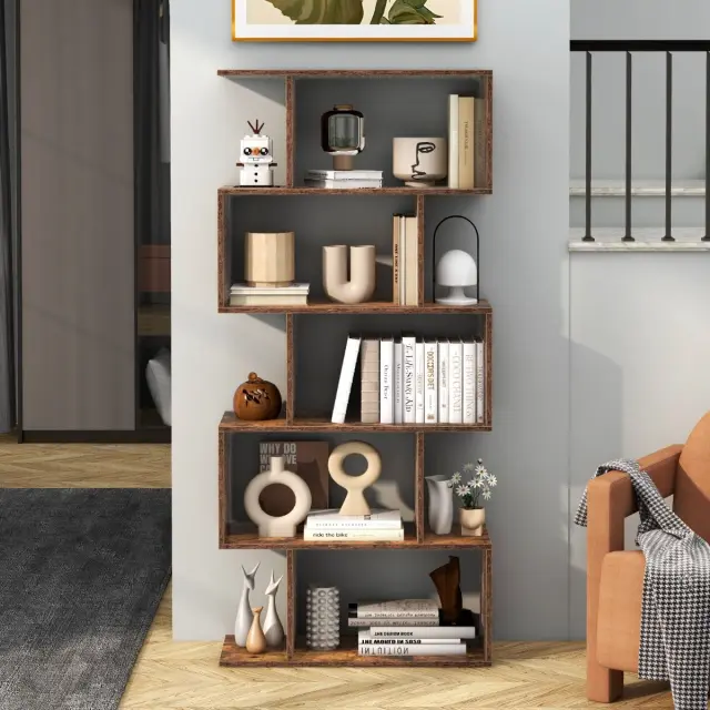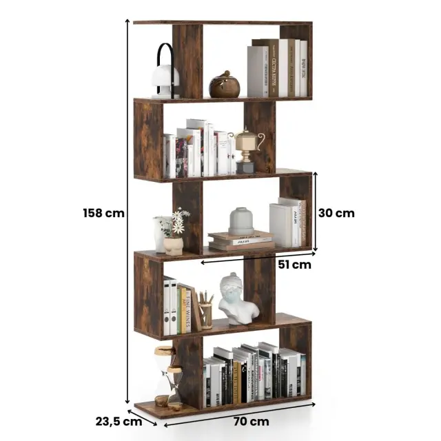 Odprte police s petimi nivoji vam ponujajo idealen prostor za shranjevanje vsakodnevnih predmetov, ki bodo urejeni in organizirani. Jasno je, da ustrezna razdelitev prostora ustvari dobro organiziran prostor. Poleg tega edinstvena zasnova v obliki črke S vašemu domu daje osvežujoč občutek in se harmonično vključuje v notranjo opremo. Odlagalno polico odlikuje velika prilagodljivost, zato je idealna kot knjižni regal, razstavna polica ali delilnik prostorov v vašem domu in pisarni. Za zanesljivo konstrukcijo lahko regal pritrdite na steno in tako preprečite njegovo zibanje ter povečate varnost. Prinesite domov to knjižno polico v obliki črke S, ki ponuja popolno ravnovesje med funkcionalnostjo in elegantnim dizajnom.