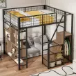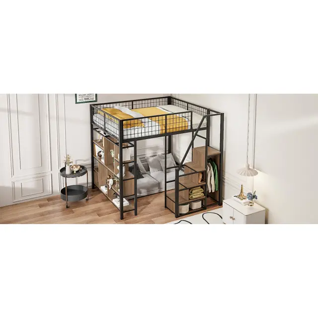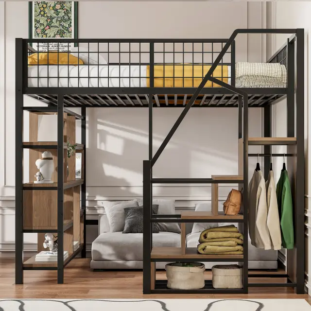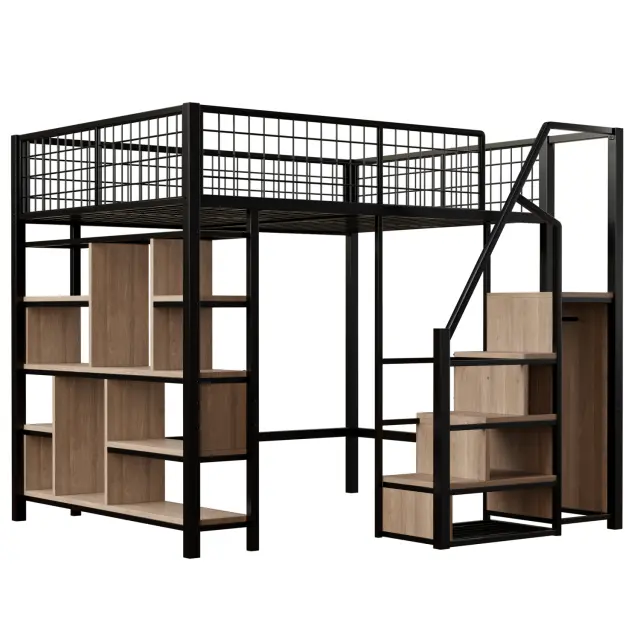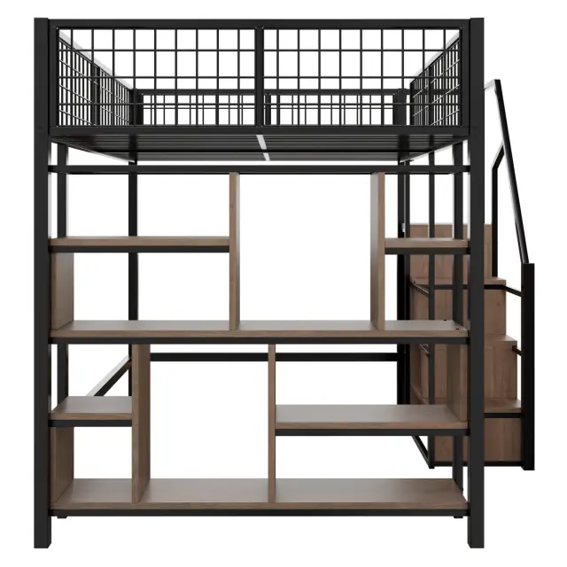 Večnamenska podstrešna postelja 140x200 cm, kovinska s prostorom za shranjevanje, polico in stopnicami, črna