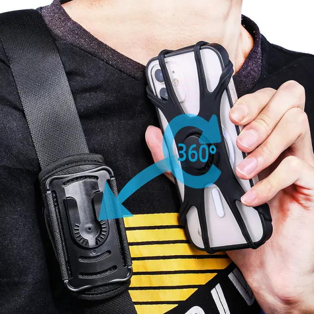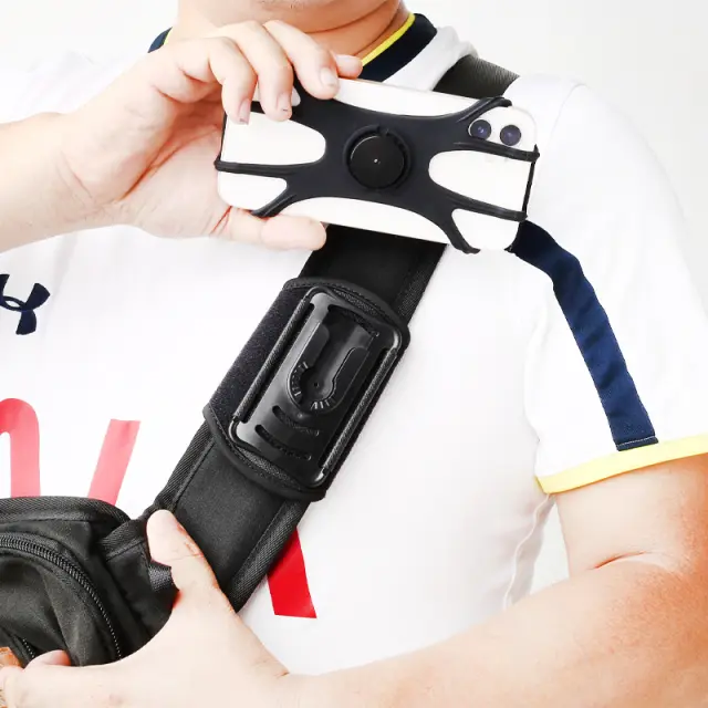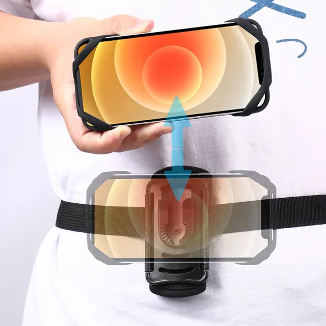 Vsestranski in nastavljiv: Zasnovan za več načinov uporabe, se lahko ta nosilec pritrdi na pasove, nahrbtnike, pasove in drugo. Njegovo vrtenje za 360° omogoča optimalne kote gledanja, ne glede na to, ali vam je ljubši pokončni ali ležeči način. Nastavljiva spona se prilagaja različnim velikostim telefonov, zaradi česar je vsestranski dodatek za različne naprave.