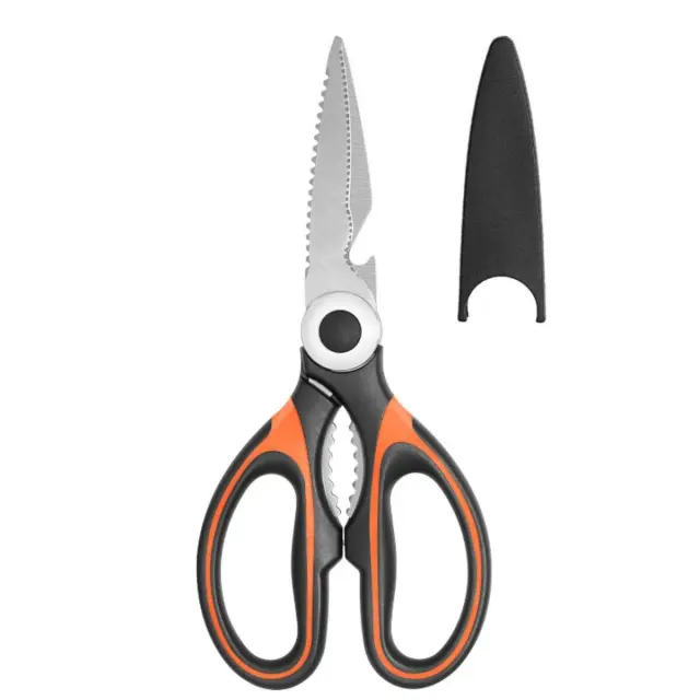 Vsestransko kuhinjsko orodje: Te večnamenske kuhinjske škarje so več kot le škarje za perutnino; vključujejo funkcije odpirača za steklenice in lešnika v enem priročnem orodju. Idealne za različna kuhinjska opravila, od rezanja piščančjih kosti do odpiranja steklenic, so te škarje vsestranski dodatek vsaki kuhinji, zaradi česar sta kuhanje in priprava hrane lažja in učinkovitejša. Integrirana zasnova prihrani prostor in zmanjša potrebo po več orodjih, kar poveča udobje za domače kuharje. Odlične za rezanje mesa, perutnine, zelenjave in celo zelišč, zagotavljajo pravi rez vsakič, kar izboljša natančnost in hitrost priprave obroka.