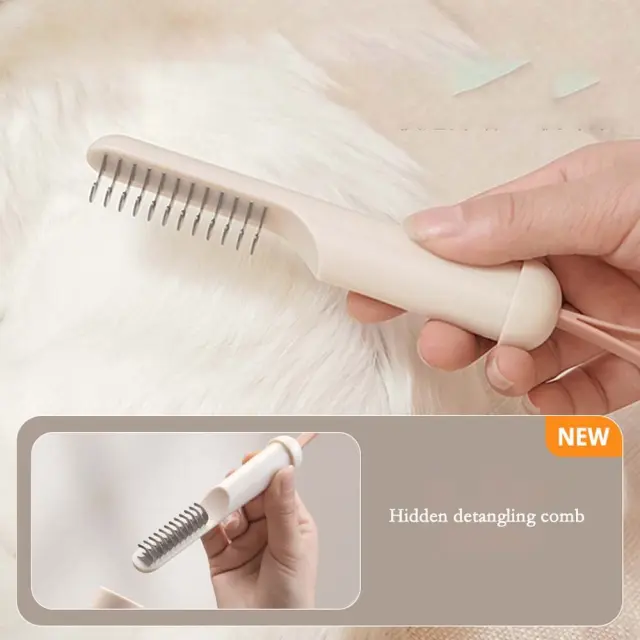 Nežno in učinkovito razčesavanje: Prosimo, upoštevajte: to niso originalni deli. Integrirano orodje za razčesavanje ima skrita rezila, ki brez težav prerežejo vozle in zaplete, ne da bi vlekli ali povzročali nelagodje vašemu hišnemu ljubljenčku. Zaobljeni zobje glavnika nežno masirajo kožo, medtem ko odstranjujejo ohlapno dlako in ostanke, spodbujajo zdravo cirkulacijo in preprečujejo draženje kože. Ta funkcija je še posebej koristna za hišne ljubljenčke z dolgo ali gosto dlako, ki je nagnjena k zapletanju. Zasnova glavnika zagotavlja nebolečo in nestresno izkušnjo nege za vašega hišnega ljubljenčka, kar olajša ohranjanje zdravja in videza njegove dlake.