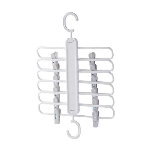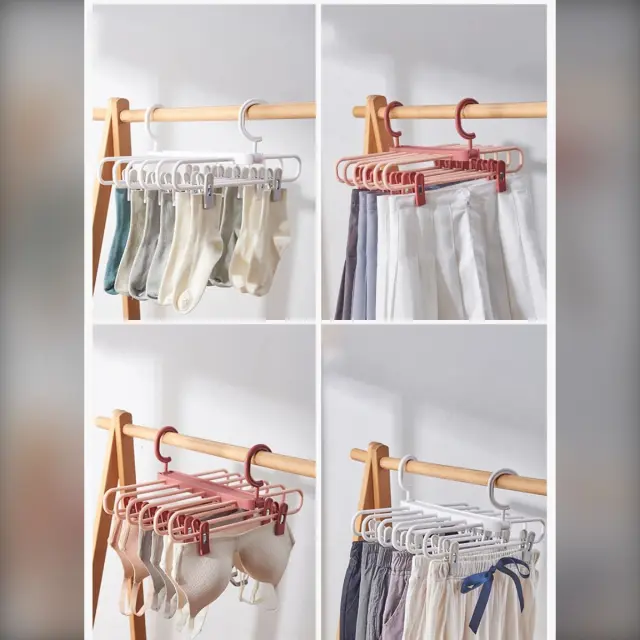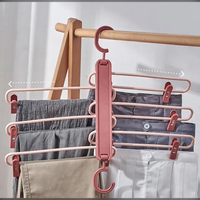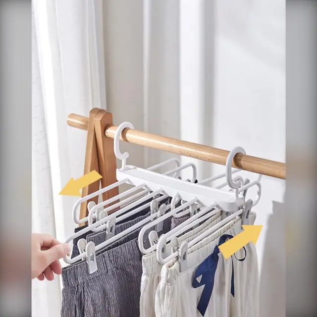 Prihranek prostora: Povečajte prostor v svoji garderobi s tem inovativnim večnamenskim zložljivim obešalnikom za hlače. Njegova kompaktna zasnova vam omogoča, da obesite več parov hlač ali drugih oblačil na en sam obešalnik, kar znatno zmanjša nered in sprosti dragocen prostor v vaši omari. Popoln za majhna stanovanja, študentske sobe ali vse, ki želijo optimizirati svoje rešitve za shranjevanje. Zložljiva funkcija omogoča enostavno shranjevanje, ko ni v uporabi, zaradi česar je bistven organizator garderobe. Ta obešalnik za hlače je prelomnica za vse, ki iščejo bolj organizirano in učinkovito omaro.