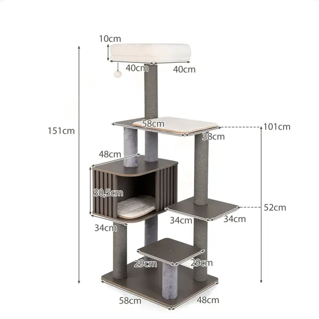 Prostoren mačji domek v obliki ograje zagotavlja udobno zatočišče za počitek in skrivanje, široka zgornja ploščad z debelo gobasto oblogo pa razkošno mesto za sprostitev in opazovanje. Ta prostorsko varčna praskalnica s šestimi ravnmi za plezanje in raziskovanje povečuje vertikalni prostor, hkrati pa se brezhibno prilega vsakemu kotičku, kar je idealno za majhne domove. Poleg tega trdne praskalnice spodbujajo zdravo nego tačk, igriv viseči pompom z zvončki pa zadovoljuje naravni instinkt vaše mačke po praskanju, raztezanju in lovljenju. S tem skrbno zasnovanim pohištvom za mačke zagotovite svoji mački popolno kombinacijo udobja, zabave in praktičnosti!